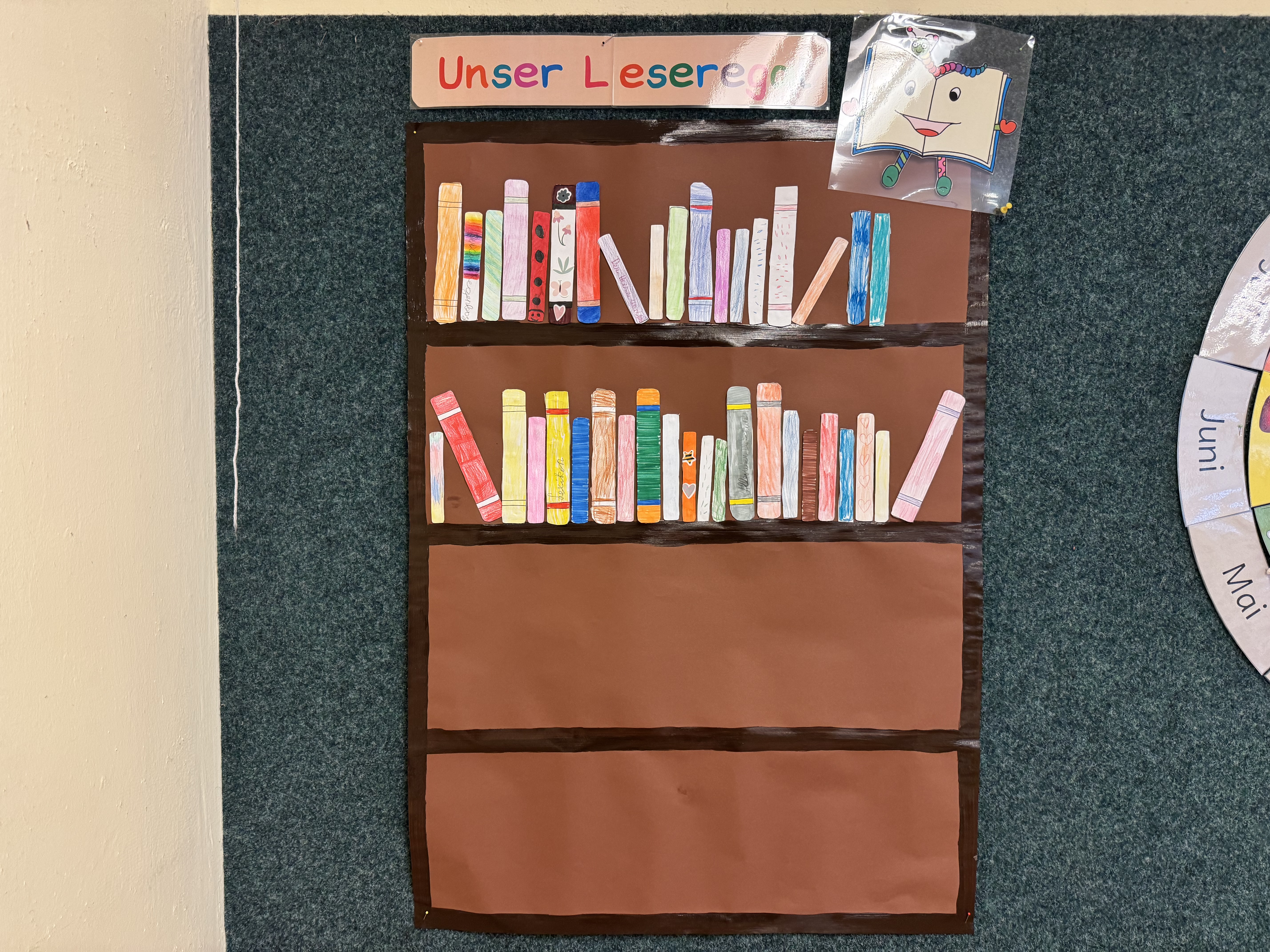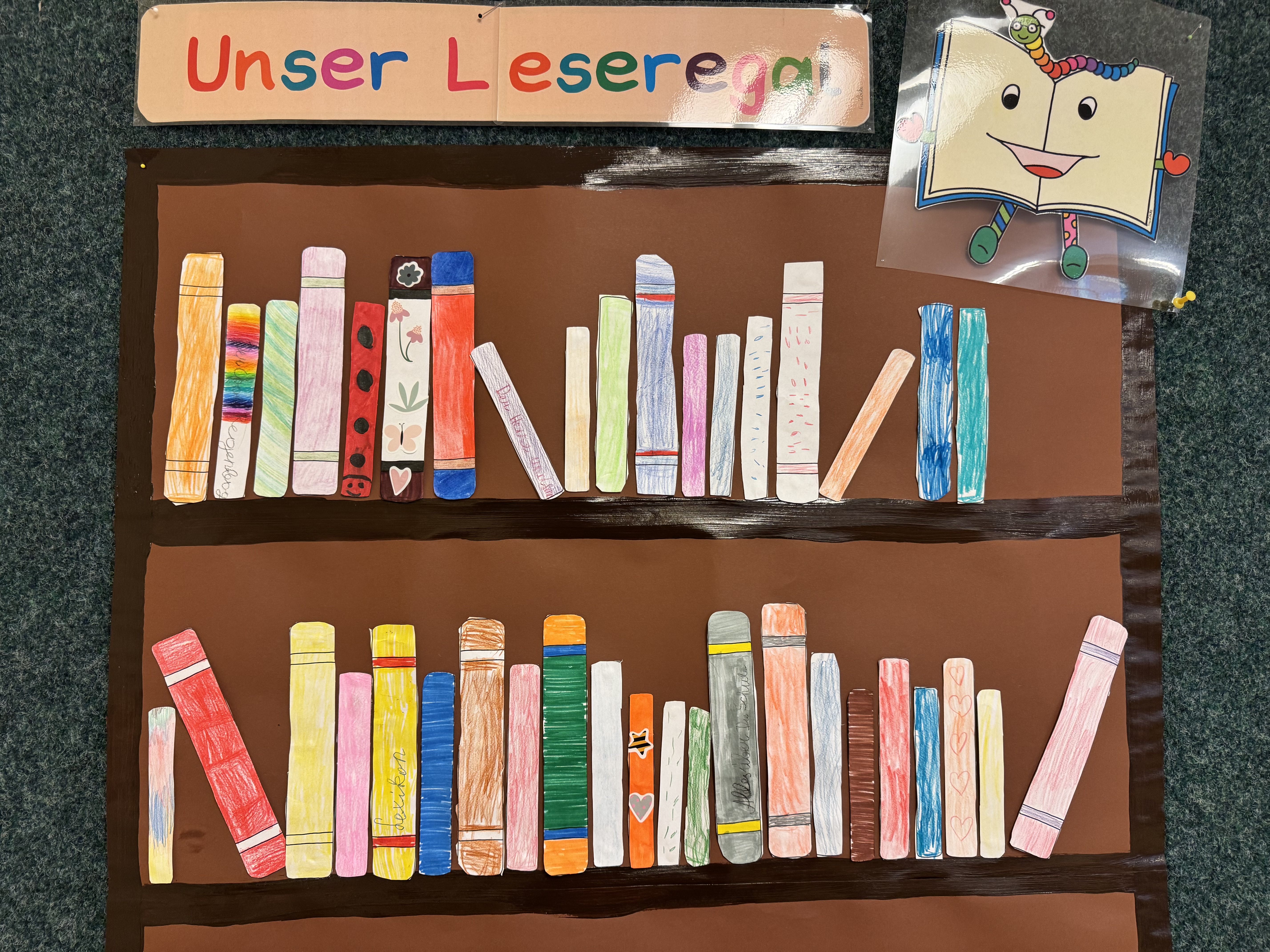 Die 2. Klasse hat bereits gemeinsam die erste Hälfte unseres Leseregals gefüllt. Die Kinder werden motiviert zu lesen denn: Je mehr gelesen wird, desto mehr Bücher bekommen die Kinder, um unser Regal zu füllen. Die Schülerinnen und Schüler haben große Freude dabei!